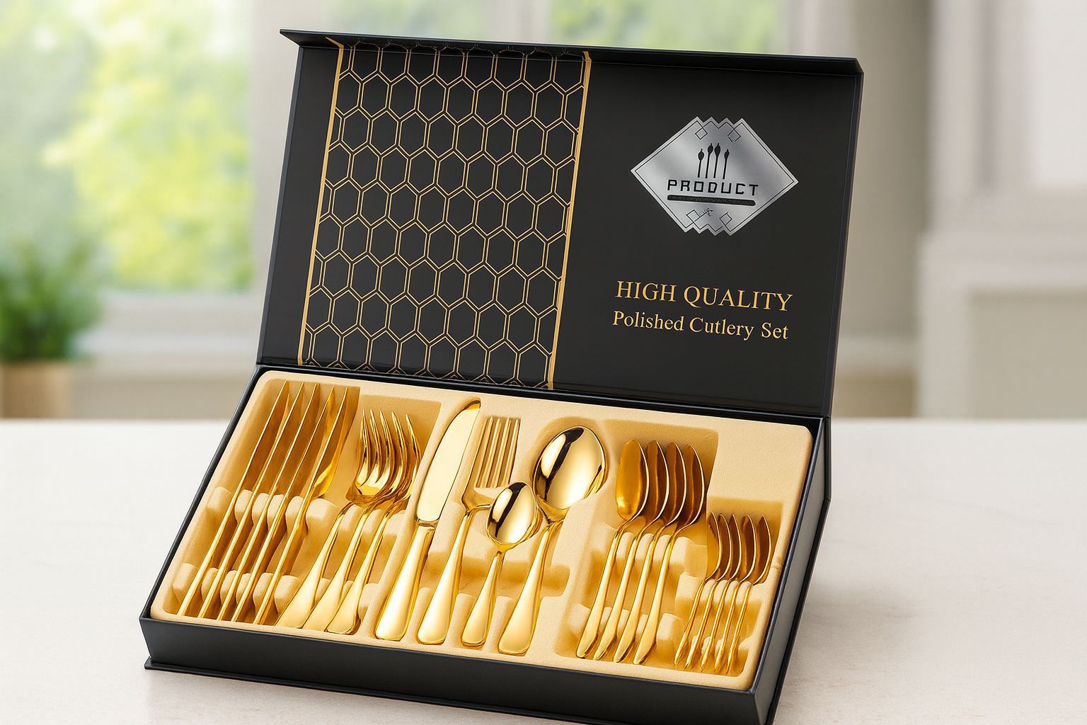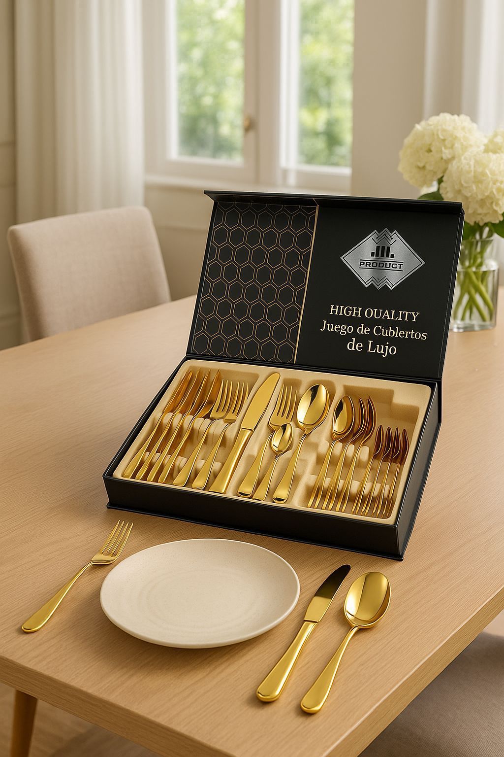 ✨ Juego de Cubiertos de Lujo Dorado ✨ 🍽️ Set de 24 piezas: cuchillos, tenedores, cucharas y cucharitas. 🌟 Acero inoxidable con acabado dorado brillante. 🏠 Aporta elegancia a cada comida. 🎁 Incluye estuche de lujo, ideal para regalo.